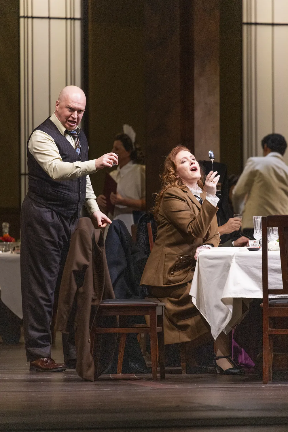 Es werden an diesem Abend also zwar immer noch viele Hosenställe geöffnet und Beine breit gemacht, unfreiwillig wie freiwillig – was übrigens Väterchen Stalin 1936 nach einem Besuch des Bolschoi-Theaters dazu brachte, das Stück absetzen zu lassen, woraufhin der Komponist eine moralisch-erotisch abgemilderte Version anfertigte. Jubelchöre marschieren auf und ab, es wird gesoffen, Muskeln glänzen, Messer blitzen, Leichen stapeln sich. Wörtlich aber nimmt das hoffentlich niemand. Alles wirkt zitiert, selbst die berüchtigte Beischlafszene im ersten Akt (wobei Beischlafszenen in der Oper immer wie Zitate wirken). Als der tote Ehemann nach der zweiten Pause aus der riesigen Torte grüßt, mit der Katerina und Sergej Hochzeit feiern wollen, verheißt das endgültig nichts Gutes. Das Leben, ein Wahnbild, ein Alpdruck.