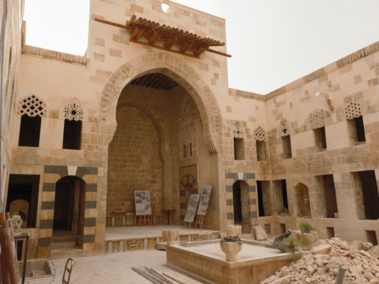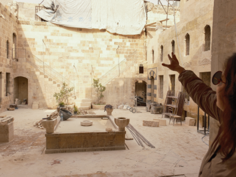 Die Altstadt von Aleppo ist still am Freitagvormittag. Die meisten Menschen treffen sich zum Gebet in den Moscheen, die Straßen sind leer. Entlang der Gassen türmen sich Steinhaufen. Vor dem Krieg standen hier Gebäude aus altem Sandstein, mit wunderschönen Innenhöfen. Sie sind ein charakteristisches Merkmal der historischen Architektur, die 1986 von der UNESCO zum Weltkulturerbe erklärt wurde. Üppig bepflanzt und mit einem Brunnen in der Mitte, tragen die Höfe zur Kühlung bei und sind kleine Oasen der Ruhe in der betriebsamen Stadt. Jetzt sind von den Gebäuden oft nur noch karge Mauern und glaslose Fenster übrig. Ganze Straßenzüge sind ausgehöhlt, auf den Steinen am Straßenrand finden sich Reste von Mosaiken. Doch hinter einer Metalltür im christlichen Viertel dröhnen Hämmer und Kreissägen.