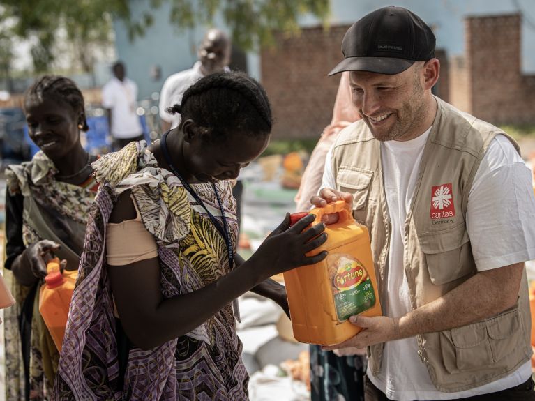 Eine Begegnung hat sich Kim Nicolai Kerkhof besonders eingeprägt: Eine Frau im leuchtend pinken Gewand strahlt, als sie Lebensmittelsäcke nach Hause trägt. Unter einem provisorischen Zelt aus Ästen und Planen sitzen ihre Kinder im Schatten. Kerkhof, Referent für Südsudan bei der Caritas, ist mehrmals im Jahr im Land und erlebt oft Erleichterung, wenn Spenden ankommen. Doch hier erfährt er: Der Mann der Frau wurde bei einem Überfall erschossen, vier ihrer Kinder entführt. Trauern kann die Witwe nicht – sie muss die verbliebene Familie versorgen. Wenigstens die Sorge um Nahrung nimmt ihr das Projekt des katholischen Wohlfahrtsverbands für die nächsten Monate.
