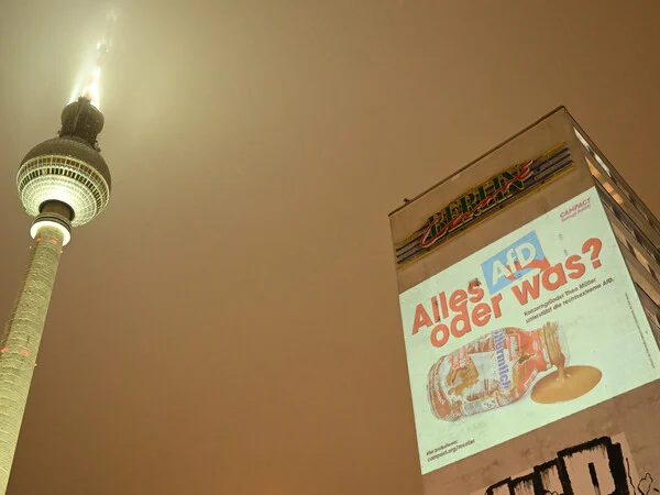 Eine Campact-Projektion mit dem Slogan „Alles AfD, oder was“ leuchtet an einer Hauswand am Alexanderplatz.