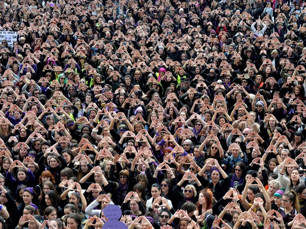 Protestierende Frauen in Bilbao am 8. März 2018 formen Dreiecke mit ihren Händen.