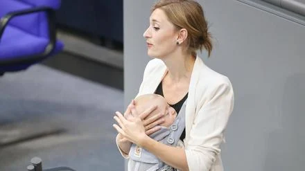politik Sep 25 Erstmals in der Geschichte des Bundestags : Berliner Grünen-Abgeordnete hält Rede mit Baby in der Bauchtrage