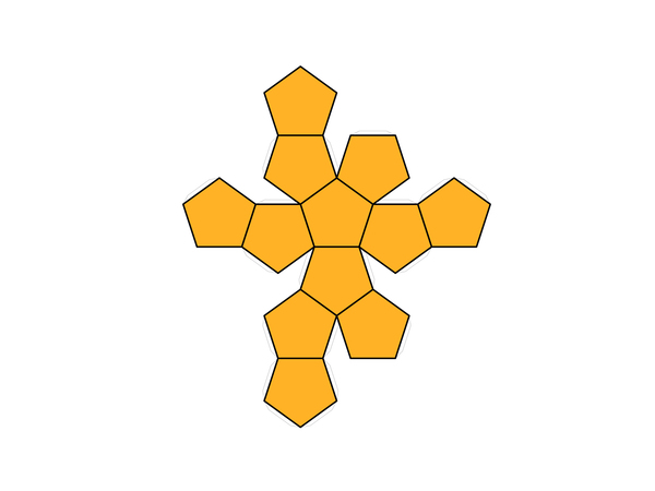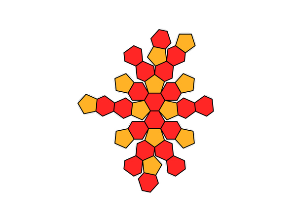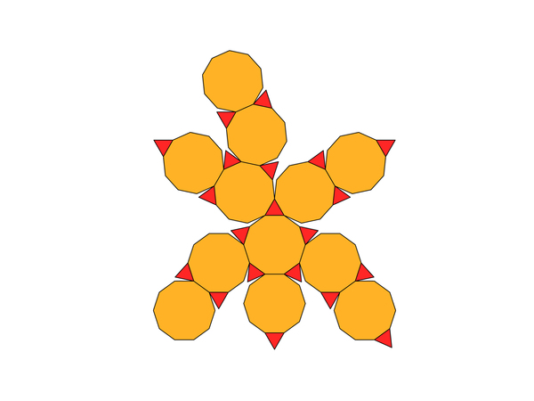 Entsprechend geht es natürlich auch weiter. Noch weniger Papierfläche braucht es, wenn das Dodekaeder zum „Dodekaederstumpf“ wird. „Stumpf“ bedeutet, dass etwas abgeschnitten wird, in diesem Falle jede einzelne Ecke jedes einzelnen Fünfecks des Dodekaeders. So werden aus den Fünfecken Zehnecke. Würde man sie um einen Ball herumlegen, würden allerdings einige dreieckige Lücken bleiben.
