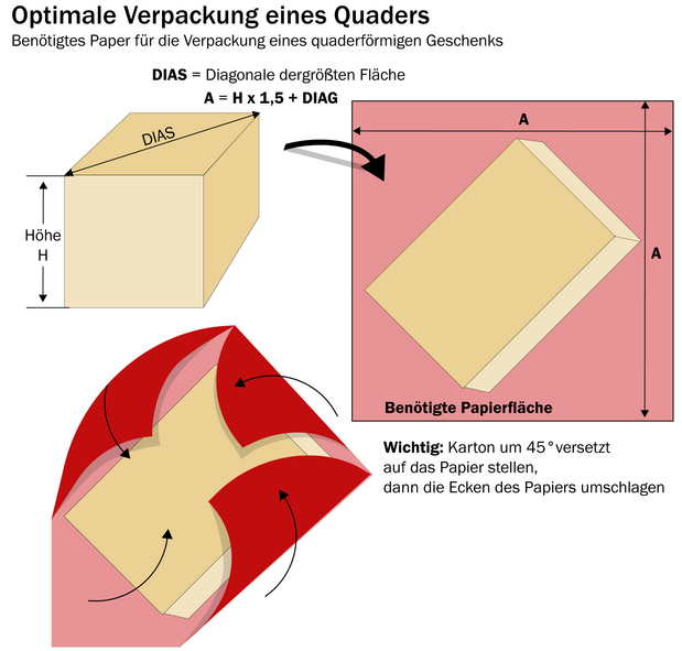 Was tun? Wenn Sie Ihre Geschenke verpacken, aber trotzdem Papier sparen wollen, dann müssen Sie jetzt ganz tapfer sein. Denn: Es geht nicht ganz ohne Mathematik. Aber die ist nicht so kompliziert und macht sogar Spaß.