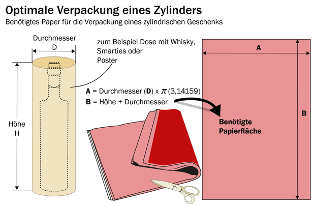 Will man den Zylinder komplett mit Papier umschließen, muss man Pi mit dessen Durchmesser multiplizieren. Das ist dann schon die eine Seitenlänge des zuzuschneidenden Geschenkpapiers. Die andere errechnet sich aus der Höhe des Zylinders plus Durchmesser. Ein bisschen Papierüberschuss bleibt beim Einfalten an den Rändern dann aber natürlich trotzdem.