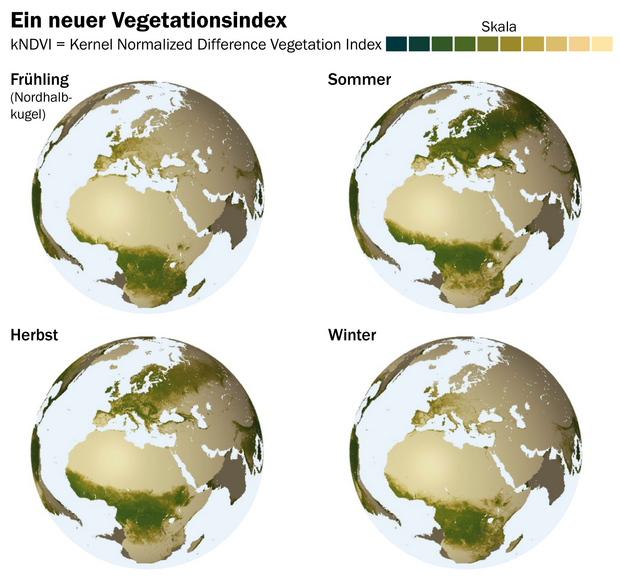 Das könnte den Forschenden zufolge aus verlängerten Wachstumsperioden und milderen Wintern in der nördlichen Hemisphäre resultieren, wo größere Landmassen zudem eine leichte Winterergrünung erlaubten. „Dies ist jedoch eine Hypothese, die wir noch weiter untersuchen müssen“, erklärte Studienleiter Miguel Mahecha von der Universität Leipzig, dem Deutschen Zentrum für integrative Biodiversitätsforschung Halle-Jena-Leipzig (iDiv) und dem Umweltforschungszentrum UFZ.